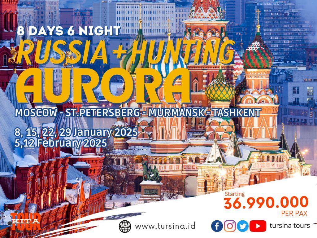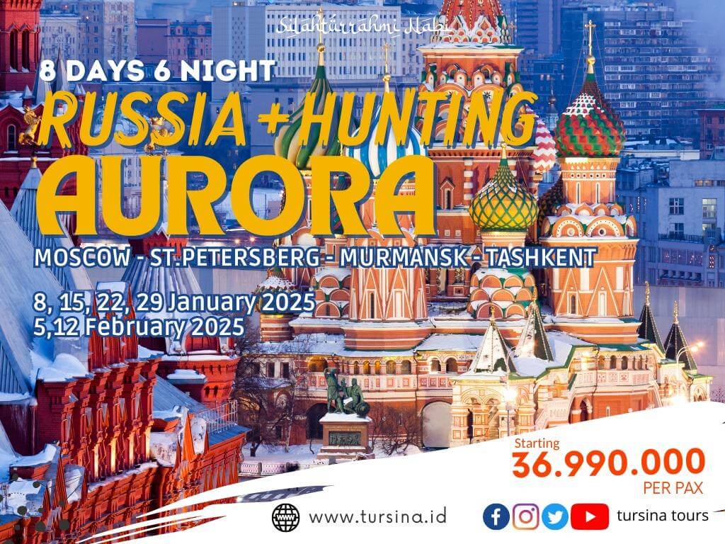- Return Flights Jakarta – St. Petersburg and Moscow - Jakarta dengan Uzbekistan Airways / setara dan Domestic Flights St. Petersburg – Murmansk – Moscow dengan Smartavia / S7 / Aeroflot / Ros